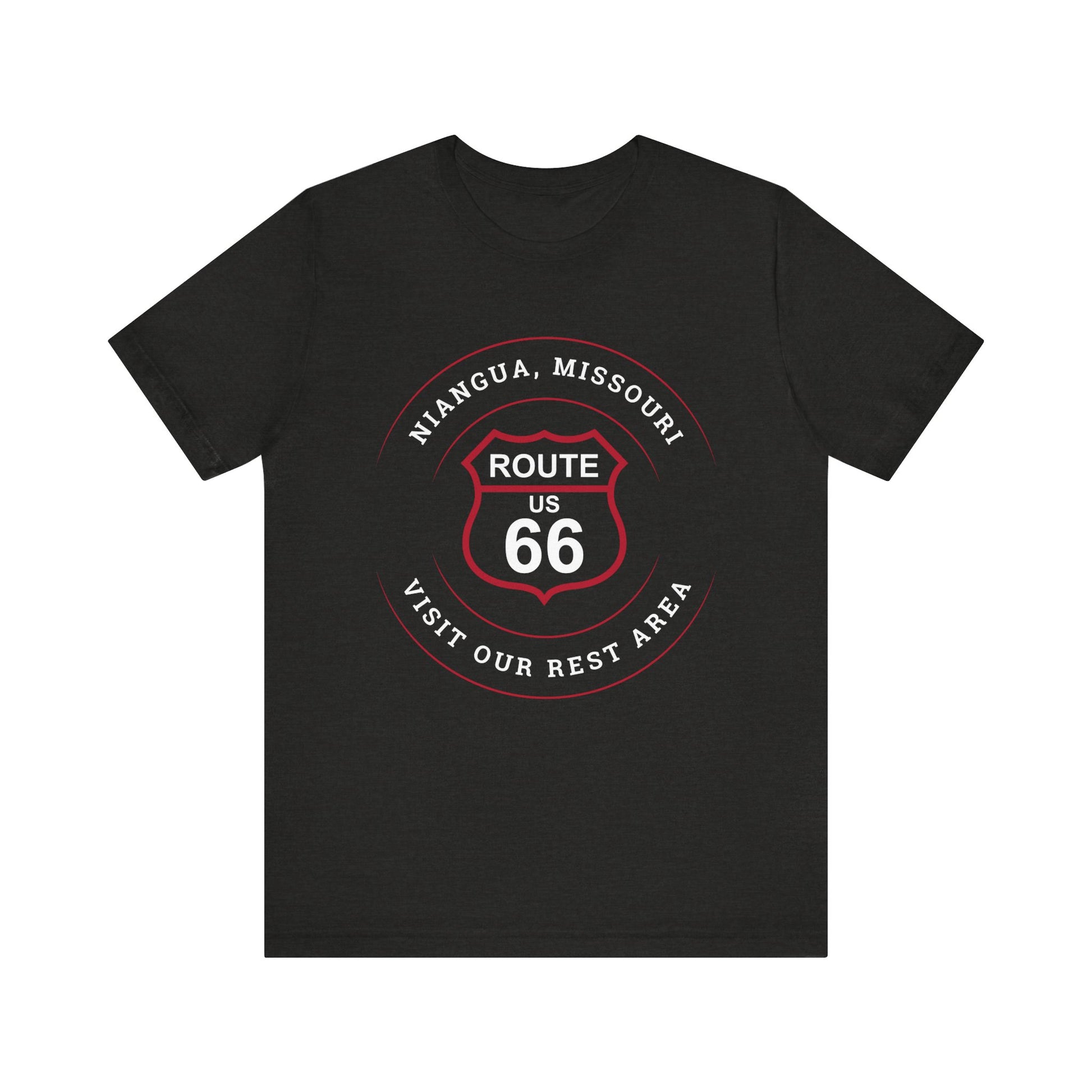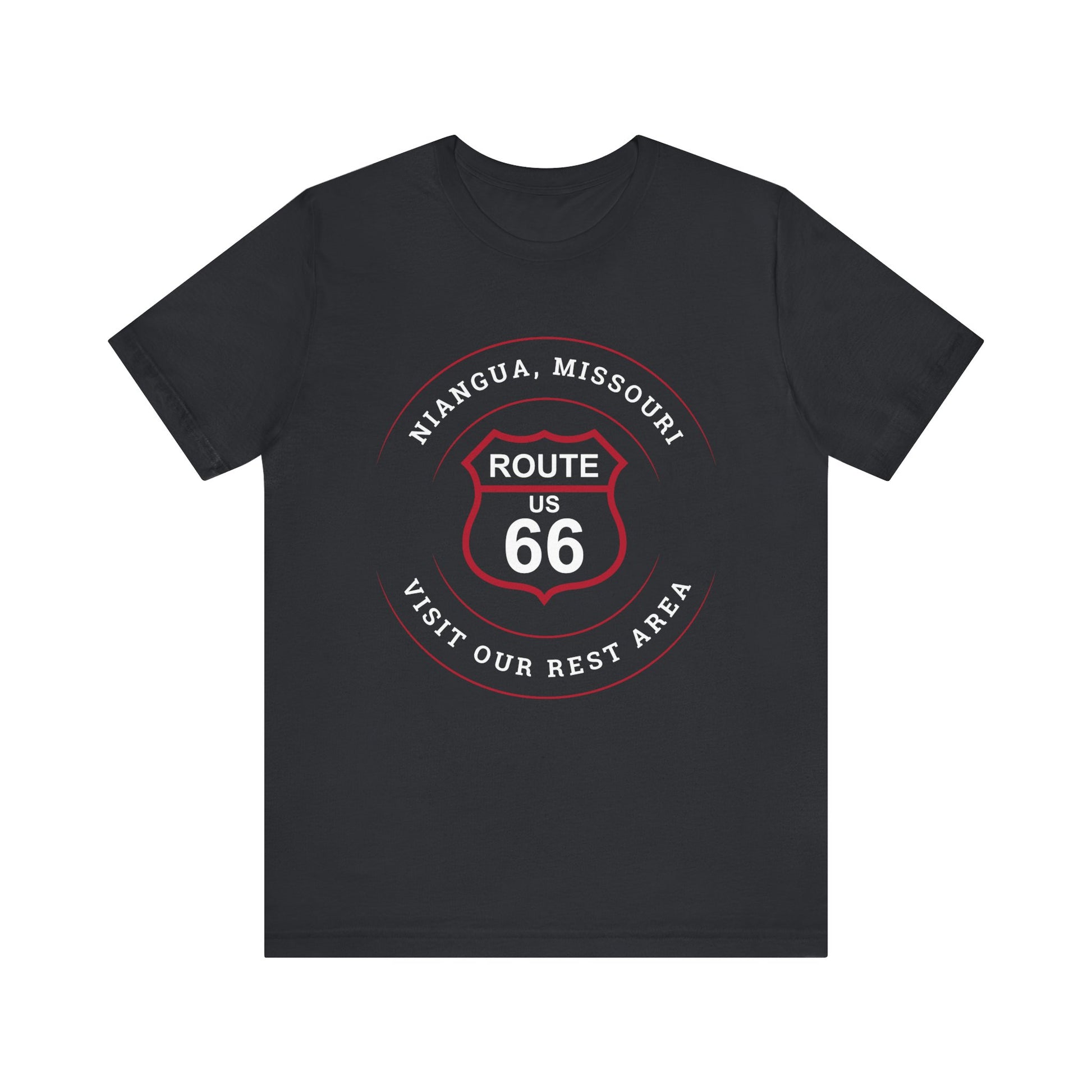 Celebrate Webster County's serene allure with this exceedingly comfortable unisex jersey tee, cleverly crafted from 100% Airlume combed and ring-spun cotton. Graced with the humble motto, "Visit Our Rest Area," this tee celebrates Niangua, Missouri: a charming Route 66 town nostalgic for its cozy respite along the Conway Rest Area, a modern-day tribute to the Mother Road.
